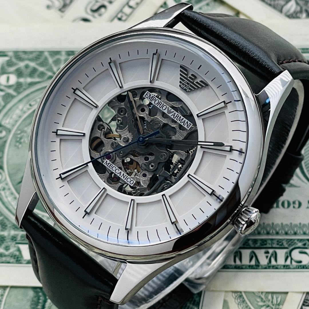 Stainless steel case with a dark brown leather strap. Fixed bezel. Skeleton dial with silver-tone hands and index hour markers. Dial Type: Analog. Automatic movement. Scratch resistant sapphire crystal. Skeleton transparent exhibition see through case back. Case size: 43 mm. Case thickness: 13 mm. Round case shape. Band width: 22 mm. Buckle clasp. Water resistant at 50 meters / 165 feet. Functions: hour, minute, second. Dress watch style. Emporio Armani Automatic Men's Watch AR1946.