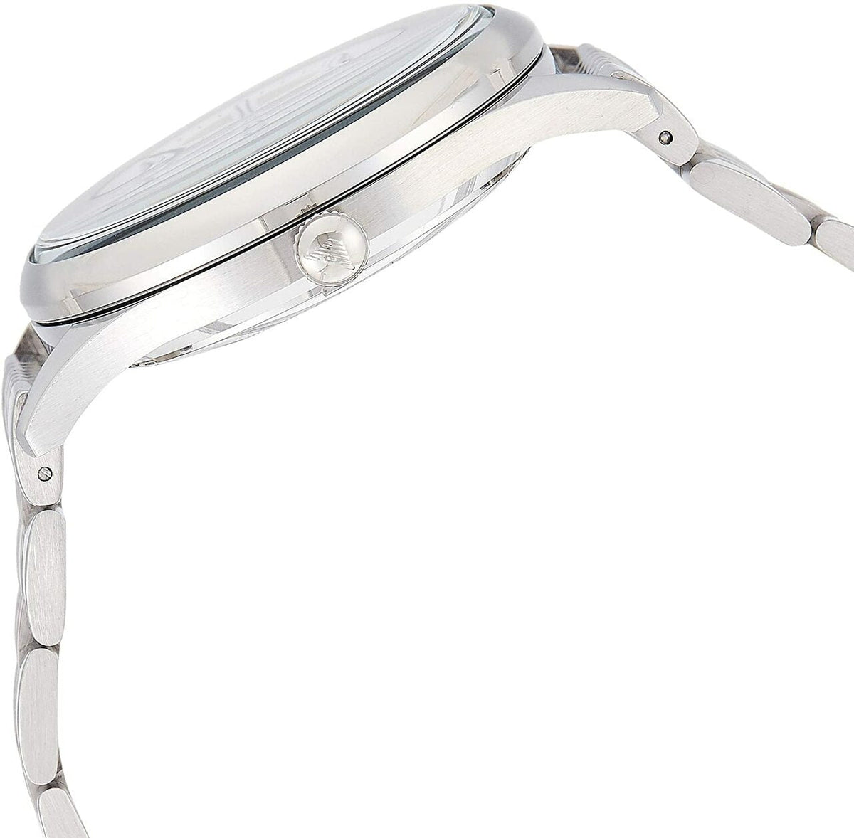 Stainless steel case with a stainless steel bracelet. Fixed stainless steel bezel. Silver (skeleton center) dial with silver-tone skeleton hands and index hour markers. Minute markers around the outer rim. The Emporio Armani logo appears at the 12 o'clock position. Dial Type: Analog.