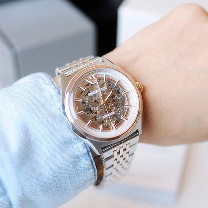 Stainless steel case with a two-tone (silver-tone and rose gold-tone) stainless steel bracelet. Fixed rose gold-tone bezel. Skeleton dial with luminous rose gold-tone hands and index hour markers. Minute markers around the outer rim. Dial Type: Analog. Luminescent hands. Automatic movement. Scratch resistant mineral crystal. Pull / push crown. Transparent case back. Round case shape. Case size: 43 mm. Case thickness: 12 mm. Band width: 22 mm. Butterfly clasp. Water resistant at 50 meters / 165 feet. Functions: hour, minute, second. Dress watch style. Emporio Armani Automatic Skeleton Dial Two-tone Men's Watch AR60002.