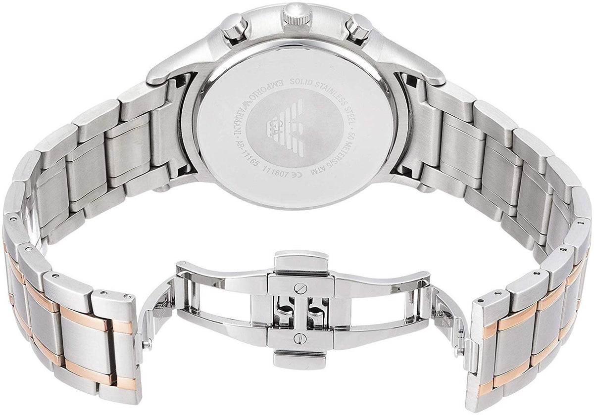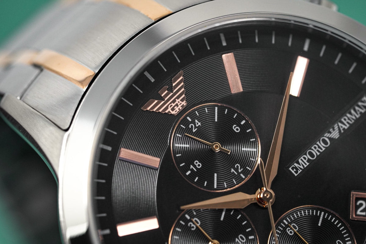 This Emporio Armani Chronograph Black Dial Two-Tone Men's Watch AR11165 features a black dial with rose gold-tone stick indexes, chronograph movement and two-tone stainless steel bracelet.