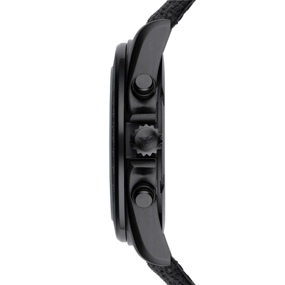 Let your most important accessory make a fashion statement with this Emporio Armani watch. Created in PVD coated stainless steel, this watch comes with a round case and a gorgeous bezel detailed with a tachymeter scale. The dial has three subdials, silver-tone markers and a date window. Complete with a nylon bracelet, this quartz watch will effortlessly complement your style.