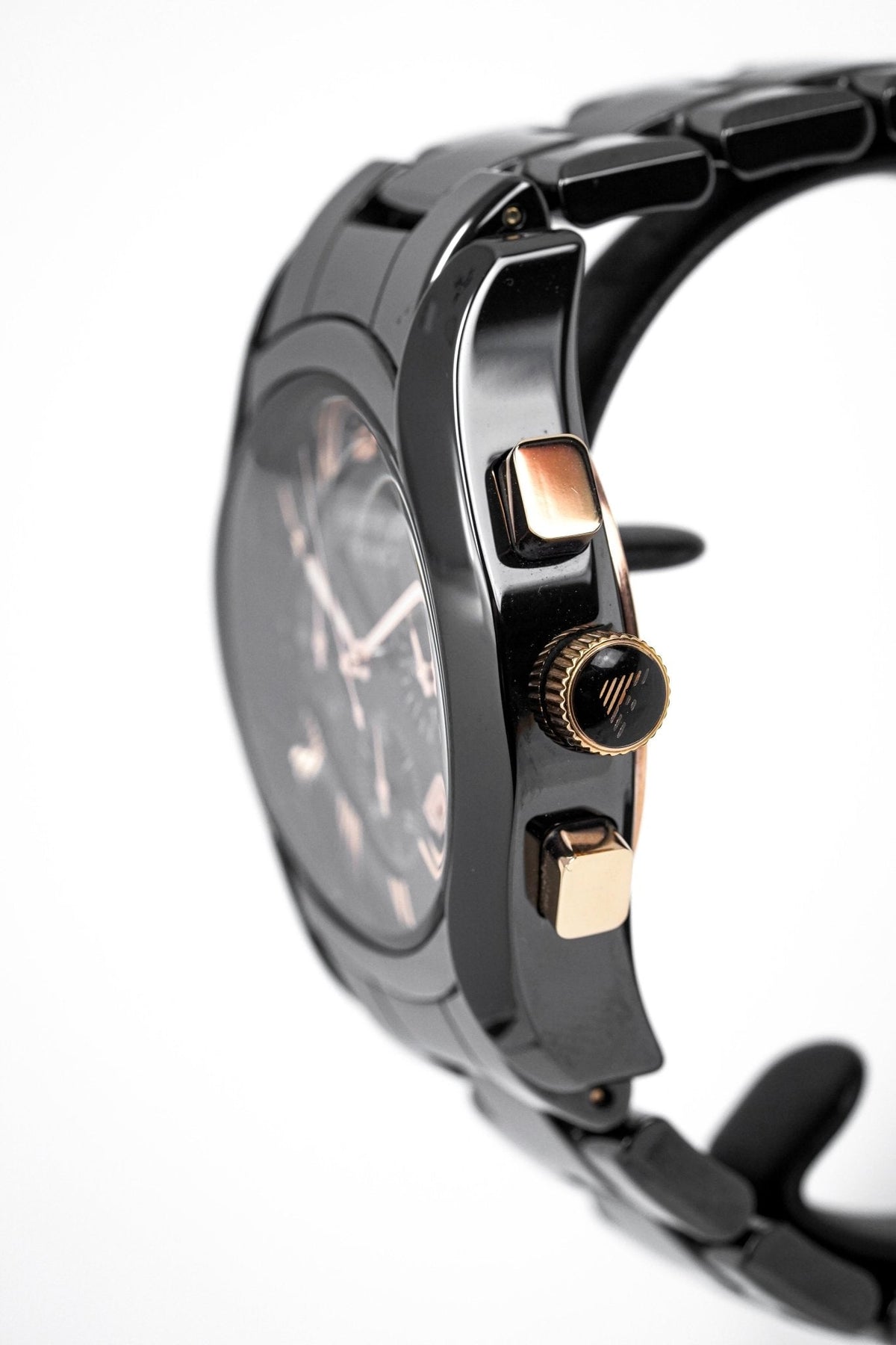 Black ceramic case with a black ceramic bracelet. Fixed black ceramic bezel. Black dial with luminous rose gold-tone hands and Roman numeral hour markers. The Emporio Eagle appears at the 12 o'clock position. Dial Type: Analog. Luminescent hands and markers. Date display between the 4 and 5 o'clock positions. Chronograph - three sub-dials displaying: 60 seconds, 60 minutes and 24 hours sub-dials.