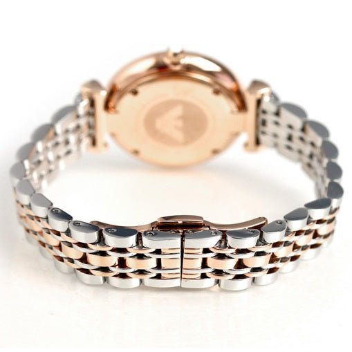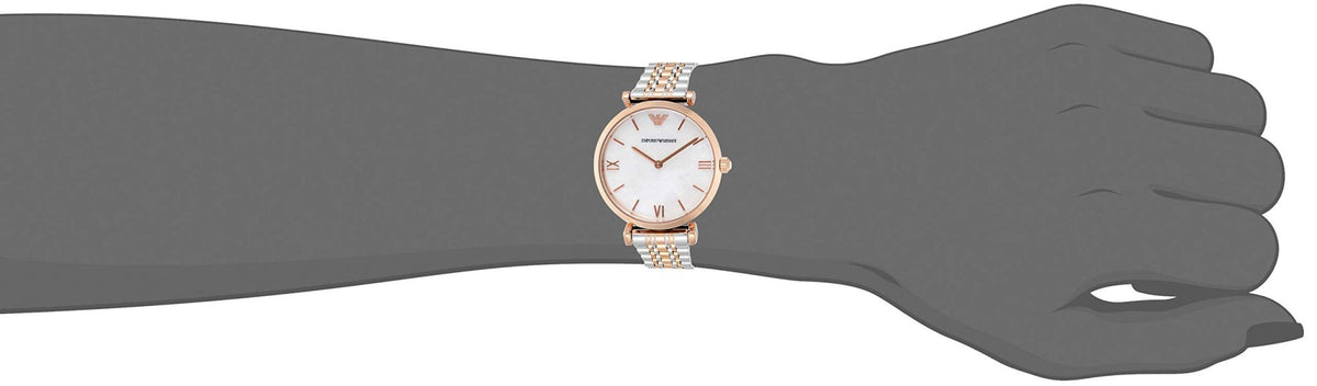 This Emporio Armani Classic Mother Of Pearl Dial Ladies Watch AR1683 comes in rose gold-plated stainless steel case with a two-tone (silver and rose gold-plated) stainless steel bracelet. Fixed rose gold-plated bezel. Mother of pearl dial with rose gold-tone hands and index hour markers. Roman numerals mark the 3, 6, 9 and 12 o'clock positions. The Emporio Armani logo appears at the 12 o'clock position. Dial Type: Analog. Quartz movement. Scratch resistant mineral crystal. Pull / push crown. Solid case back. Case diameter: 32 mm. Case thickness: 7.5 mm. Round case shape. Band width: 14 mm. Deployment clasp. Water resistant at 50 meters / 165 feet. Functions: hour, minute. Casual watch style.