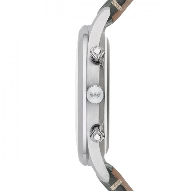 Stainless steel case with a grey croco-embossed leather strap. Fixed stainless steel bezel. Silver dial with silver-tone hands and alternating Arabic numeral and index hour markers. Minute markers around the outer rim. The Emporio Armani logo appears at the 12 o'clock podition. Dial Type: Analog. Date display at the 4 o'clock position. Chronograph - three sub-dials displaying: 60 second, 60 minute and 24 hours. Quartz movement. Scratch resistant mineral crystal. Pull / push crown. Solid case back. Case size: 43 mm. Case thickness: 11.85 mm. Round case shape. Band width: 22 mm. Tang clasp. Water resistant at 50 meters / 165 feet. Functions: chronograph, date, hour, minute, second. Dress watch style. Emporio Armani Classic Silver Dial Men's Chronograph Watch AR1861.