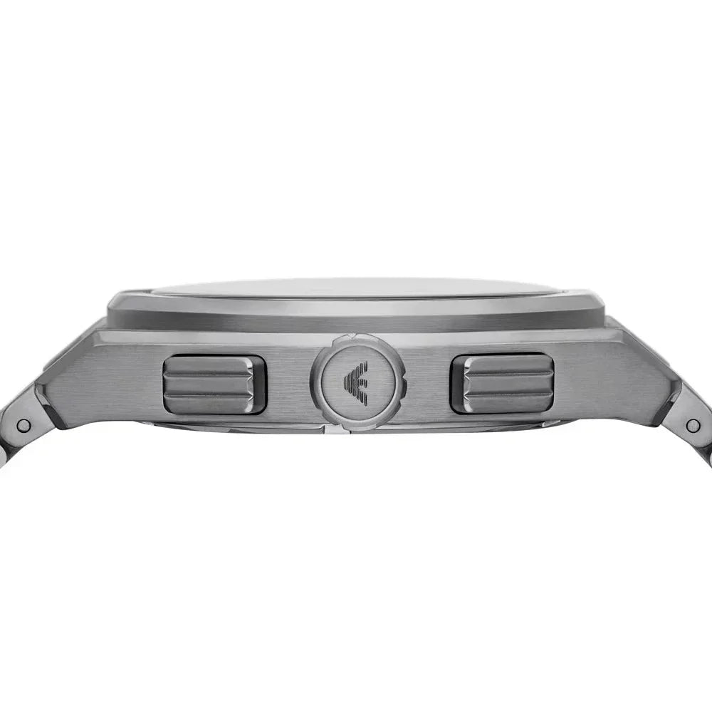 Emporio Armani's 43mm watch features a black cd finish dial, chronograph movement and stainless steel case and bracelet.