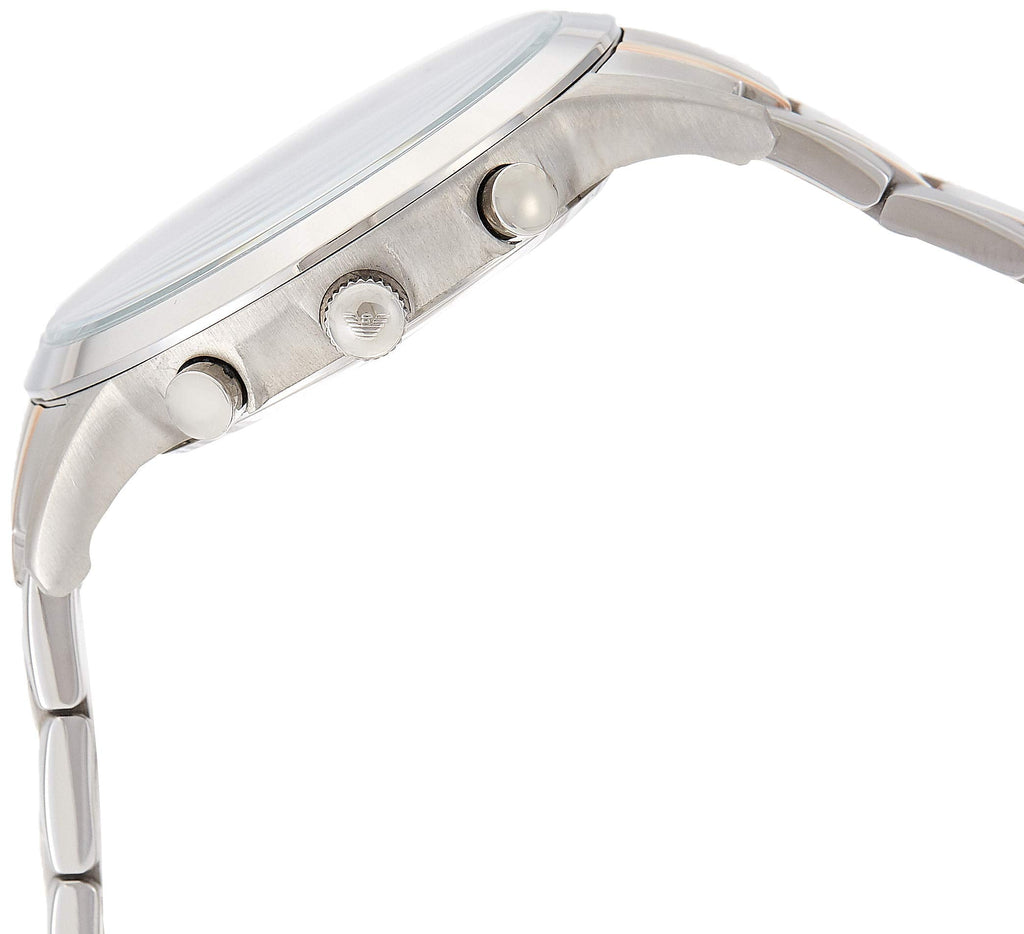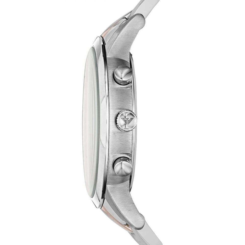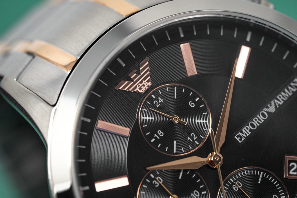 Black Dial with Stainless Steel Hands and Rose Gold Plated Baton Hour Markers. 24 Hour Counter at 12 O'Clock. Small Seconds at 6 O'Clock. 30 Minute Counter at 9 O'Clock. Date Window between 4 and 5 O'Clock and Armani Logo at 12 o’clock