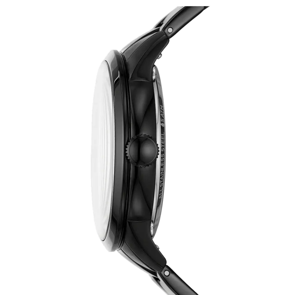 An arresting skeletal dial with gold-toned inner gears perfectly balanced with black Roman numeral and linear indexes and a matte black body, think of Townsman by Fossil as your best-dressed essential. This 44mm timepiece features a black brushed dial, automatic movement and a black stainless steel bracelet.