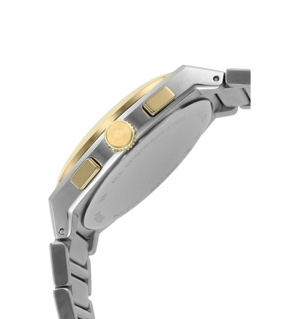 Stainless steel case with a two-tone (silver-tone and gold-tone) stainless steel bracelet. Fixed gold-tone bezel. Cream dial with luminous gold-tone hands and index hour markers. Arabic numeral minute markers (at 5 minute intervals). Minute markers around the outer rim. Dial Type: Analog. Luminescent hands and markers. Date display at the 3 o'clock position.