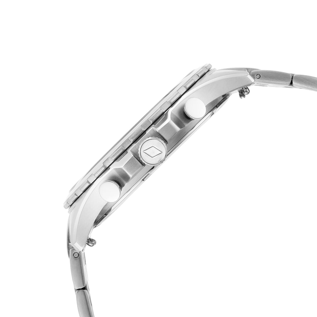 Stainless steel case with a stainless steel bracelet. Fixed stainless steel bezel. Blue dial with luminous silver-tone hands and index hour markers. Arabic numerals appear at the 3, 6, 9 and 12 o'clock positions. Minute markers around the outer rim. Dial Type: Analog. Luminescent hands and markers. Date display between the 4 and 5 o'clock positions.