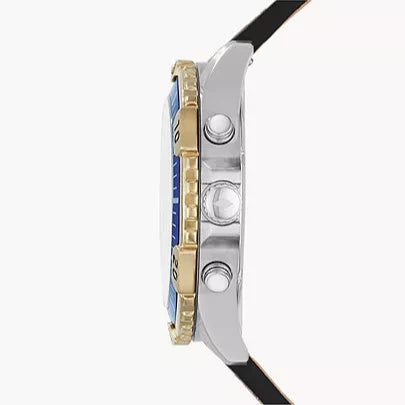 Stainless steel case with a brown leather strap. Fixed yellow gold-tone bezel with a blue ring. Blue dial with luminous yellow gold-tone hands and index hour markers. Minute markers around the outer rim. Dial Type: Analog. Luminescent hands and markers. Chronograph - three sub-dials displaying: 60 second, 30 minute and 24 hour.