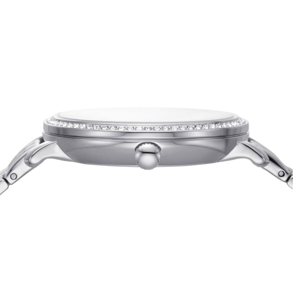 Fossil ES-5164 Jacqueline Metal Band Women Watch. The case is made out of silver stainless steel with a silver and pearl bezel, which stands for the high quality of the item, it has a white color dial. This model has got 30 meters of water resistance. it can be worn in scenarios where it is likely to be splashed but not immersed in water and will be fine in rain. The watch is shipped with an original box and a guarantee from the manufacturer.