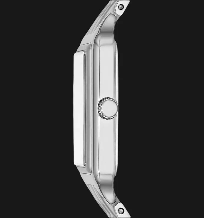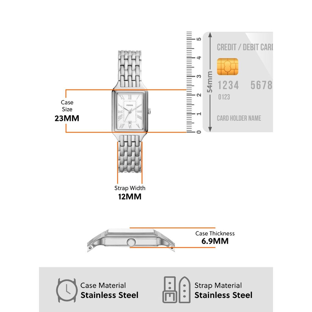 The Fossil ES5221 Raquel watch combines a 23mm rectangular-shaped stainless steel case and silver stainless steel bracelet with a push button deployment clasp. It has a silver analogue dial with silver indexes and hands with the date display visible at position six, protected beneath mineral crystal glass. Power is generated by the quartz movement. This model also has a water resistance of up to 50 metres.