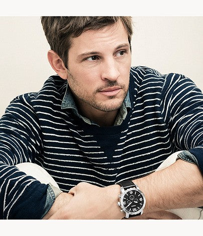 Quartz movement. Scratch resistant mineral crystal. Solid case back. Case diameter: 50 mm. Case thickness: 14 mm. Round case shape. Band width: 24 mm. Band length: 8.5 inches. Tang clasp. Water resistant at 50 meters / 165 feet. Functions: date, hour, minute, second. Casual watch style. Fossil Nate Chronograph Black Dial Black Leather Men's Watch JR1436.