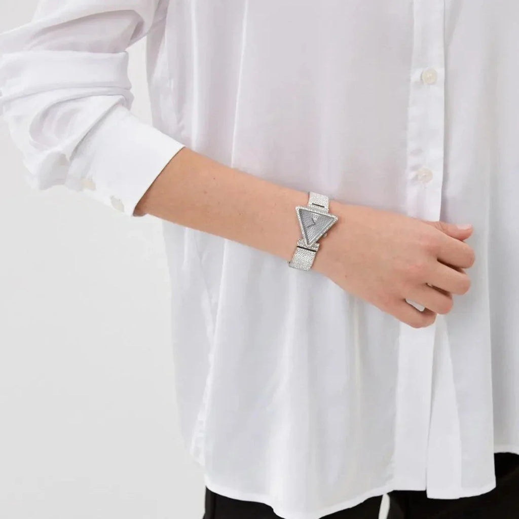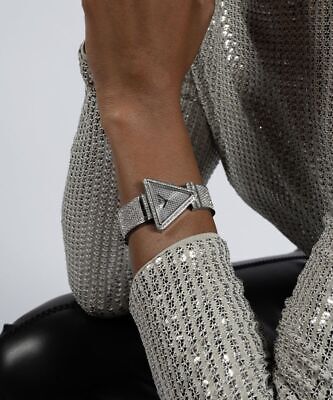 The captivating case design of this GUESS triangular logo is completely glamorous with a tonal dial and a sleek pave crystal bracelet. This eye-catching case design featuring the Guess triangular logo looks totally dazzling with a tonal dial and elegant pavé crystal bracelet.