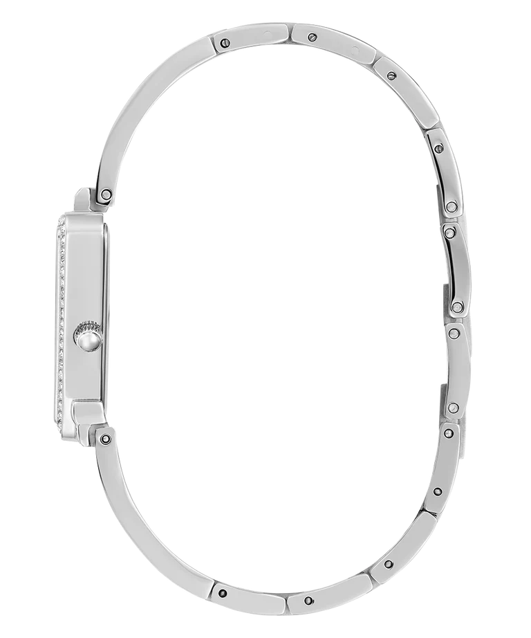 This alluring case design of the GUESS triangle logo has a fully glitz look with tonal dial and sleek pave crystal bangle