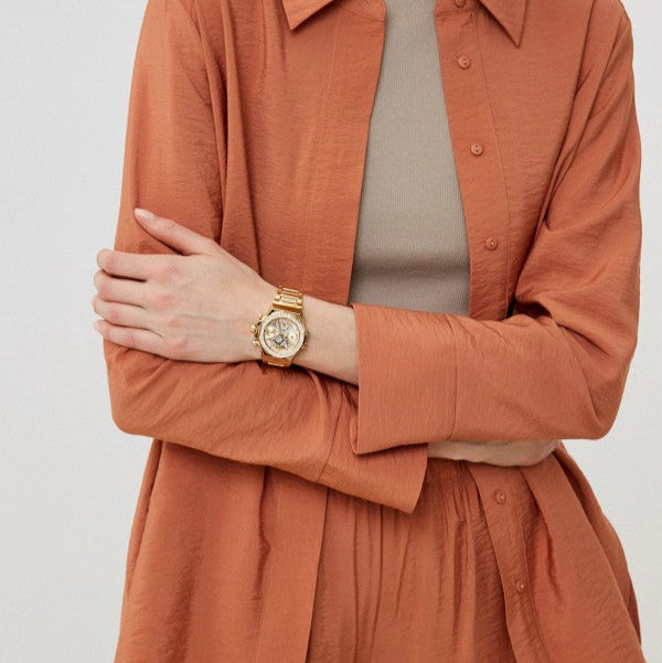 The Guess Fusion GW0552L2 women's watch has a golden envelope and a stainless steel bracelet. On the shield decorated with the same color, we will find complications of dates of the month of the month, days of the week and daily time. Water resistance in class 5 ATM protects the quartz mechanism in the event of splashing.