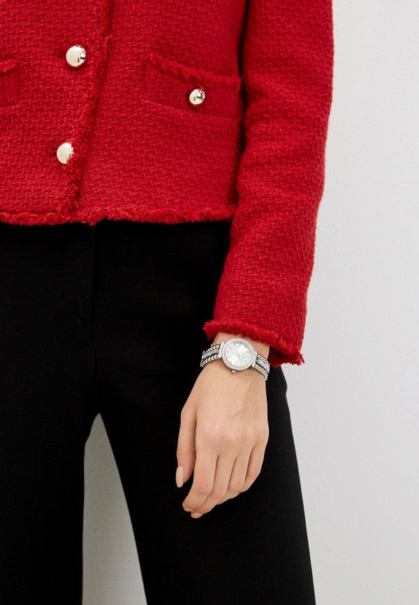 This intricate bracelet design is truly one of kind and beautifully crafted with its unique ball and crystal connection featuring a fully crystal bezel with tonal dial.