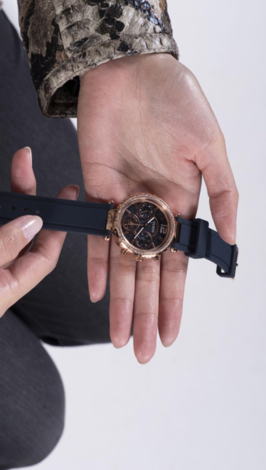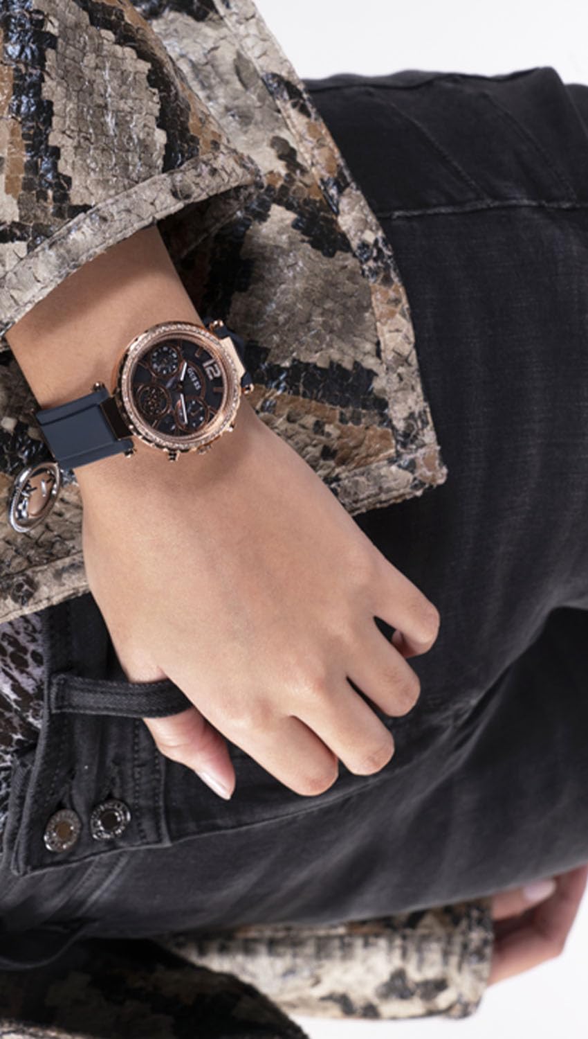 Sweetly sophisticated, this silhouette features a rose gold-tone crystal case on a smooth silicone strap making this combination the perfect pair.