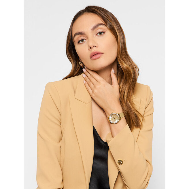 GUESS Ladies watch featuring a polished gold case with crystal detailing, sunray champagne glitz logo dial and polished gold Mesh Bracelet bracelet, with adjustable G-Links.