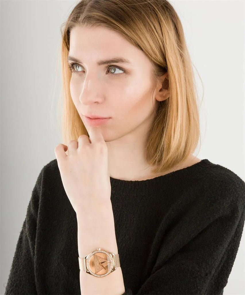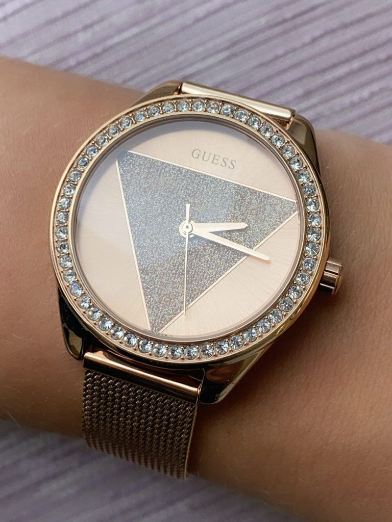 Guess Tri Glitz Quartz Diamonds Rose Gold Dial Rose Gold Mesh Bracelet Watch For Women - W1142L4