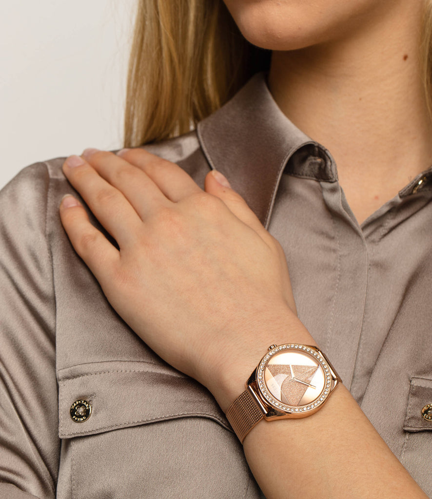 GUESS Ladies watch featuring a polished rose gold case with crystal detailing, sunray rose glitz logo dial and polished rose gold mesh bracelet, with adjustable G-Links. Stainless steel case, Stainless steel mesh bracelet, Rose gold dial, Quartz movement, Scratch resistant mineral, Water resistant up to 3 ATM - 30 meters - 100 feet