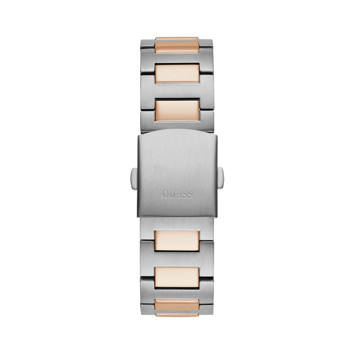 Sport meets sophistication with the Guess 42mm Quartz Watch GW0572G4. This timepiece combines a sleek stainless steel and rose IP material construction with a bold round shape, making it a versatile accessory for any occasion.