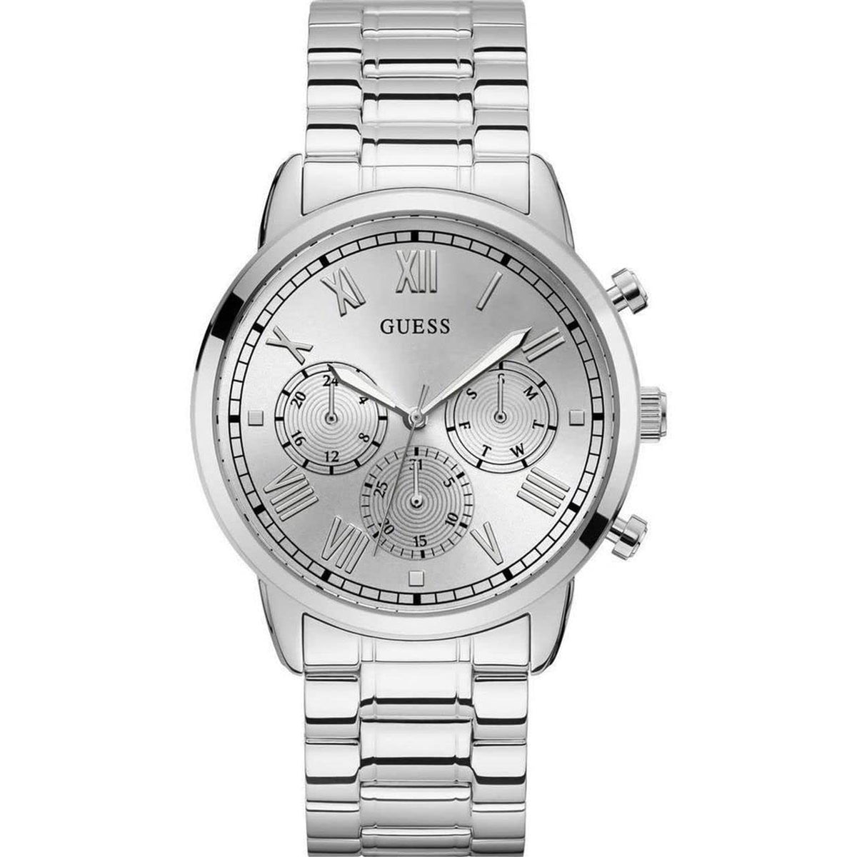 Men's multifunction watch by Guess. The size of the case is 44 mm and is made of polished steel. The quandrante is silver. The bracelet is made of polished steel. Folding clasp. Water resistance is 50 meters