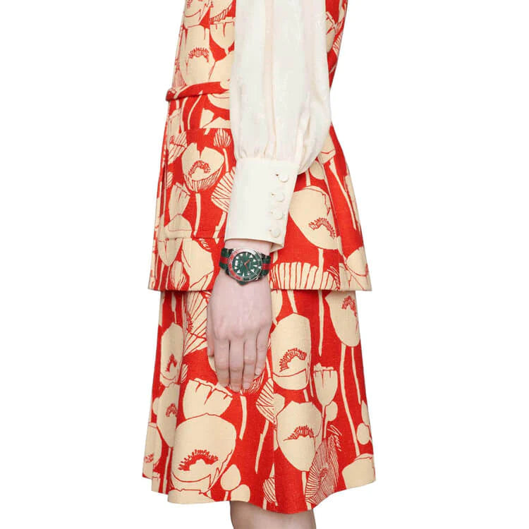Housed in a durable stainless steel case with a Web stripe strap made from recycled polyester, it features a unidirectional bezel and a striking dual-coloured dial adorned with Gucci’s signature emblems on the indices. Engineered in Switzerland, it’s powered by quartz ETA movement, so you’ll never miss a meeting again.