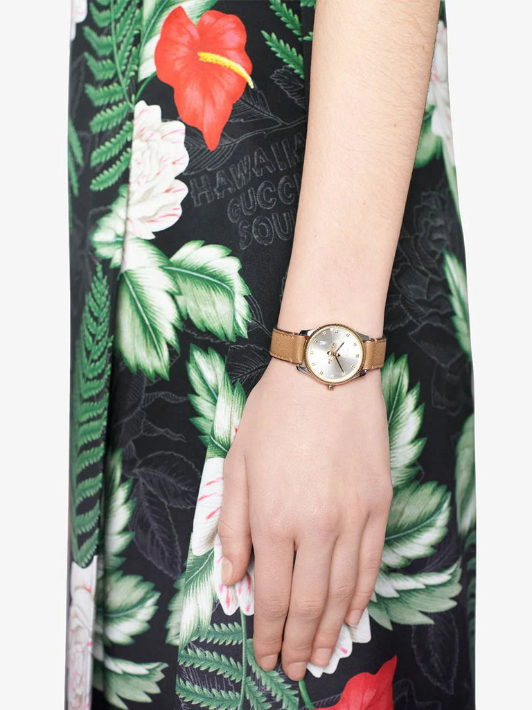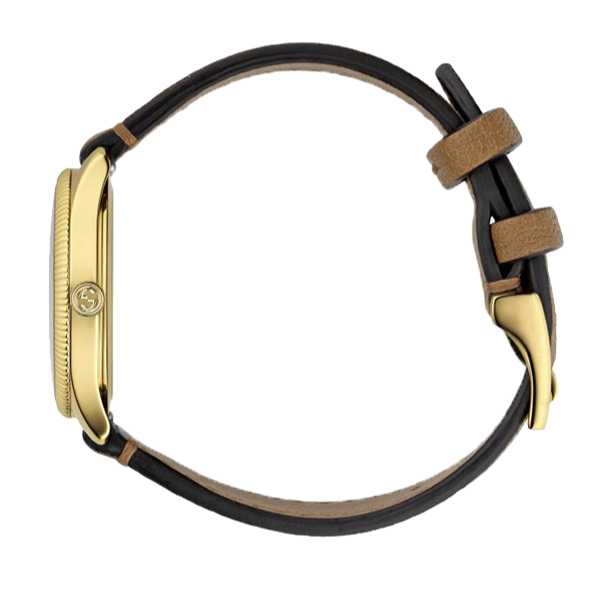 Part of the G-Timeless collection, this classic watch in yellow gold PVD with a taupe lambskin strap is crafted with a traditional sensibility, juxtaposed with a sunbrushed dial. The bee motif is specially designed to work as the seconds hand.