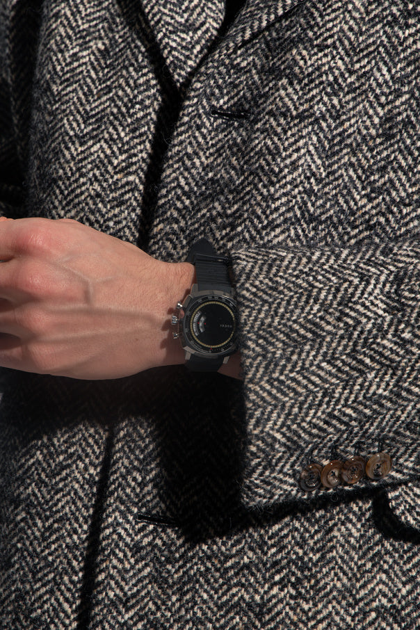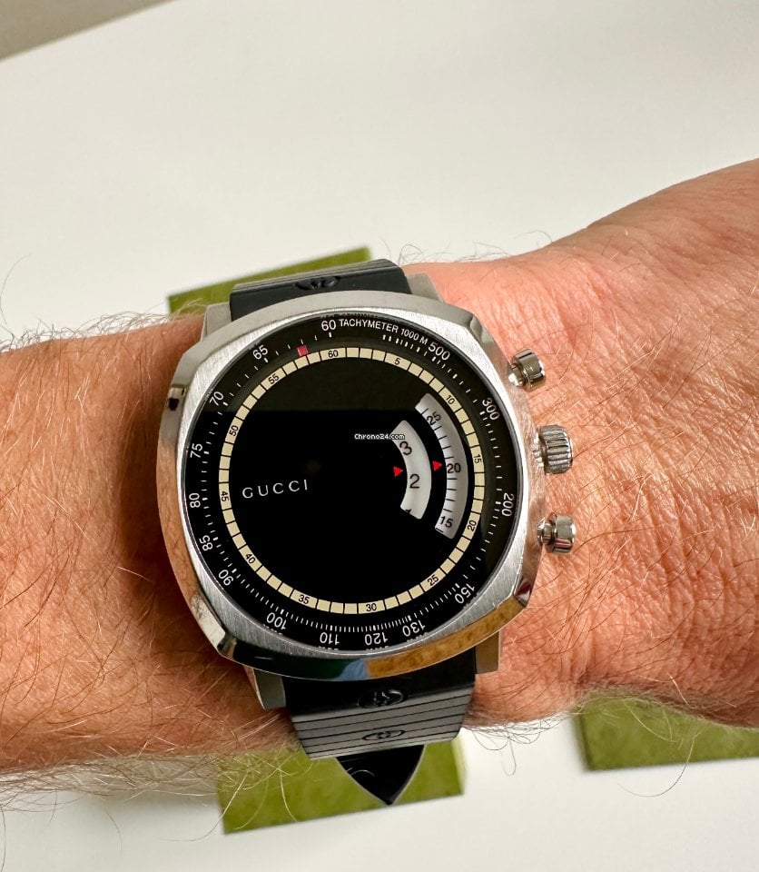 The sporty Grip watch has been updated and upgraded to a chronograph, with a dashboard-inspired dial that displays the time in easy-to-read windows. Gucci logo branding is etched on the caseback and subtly details the band.