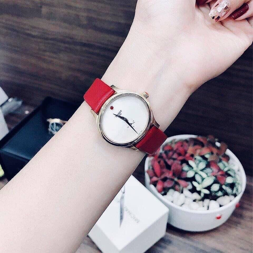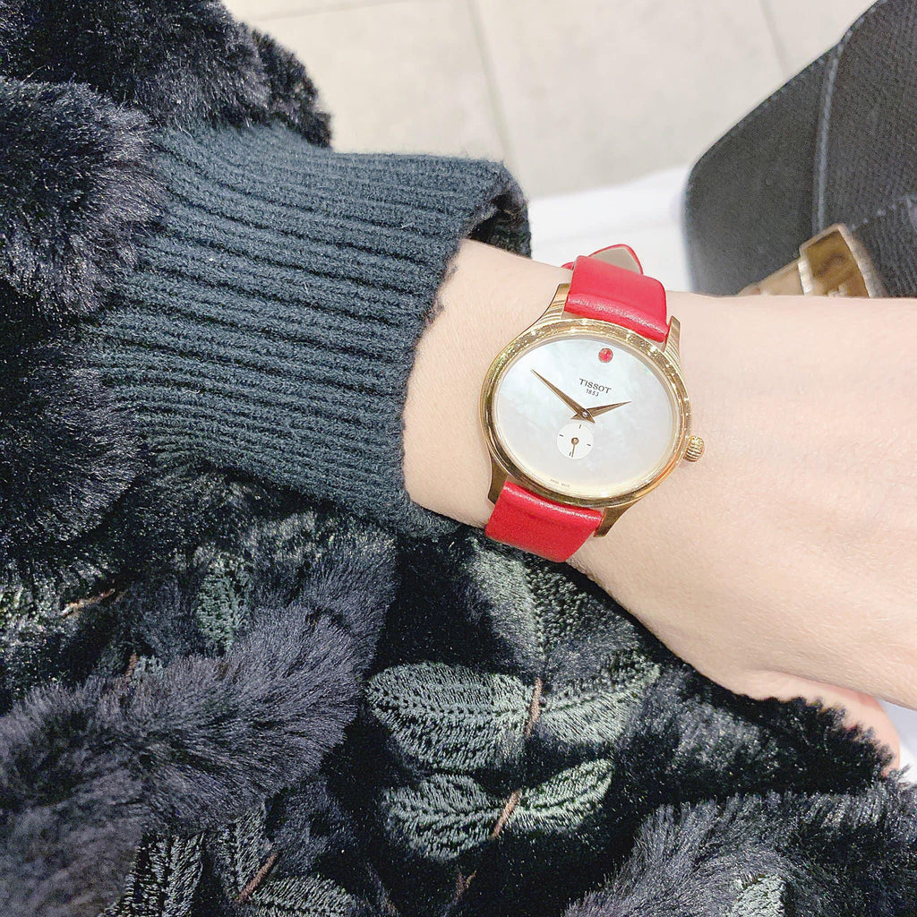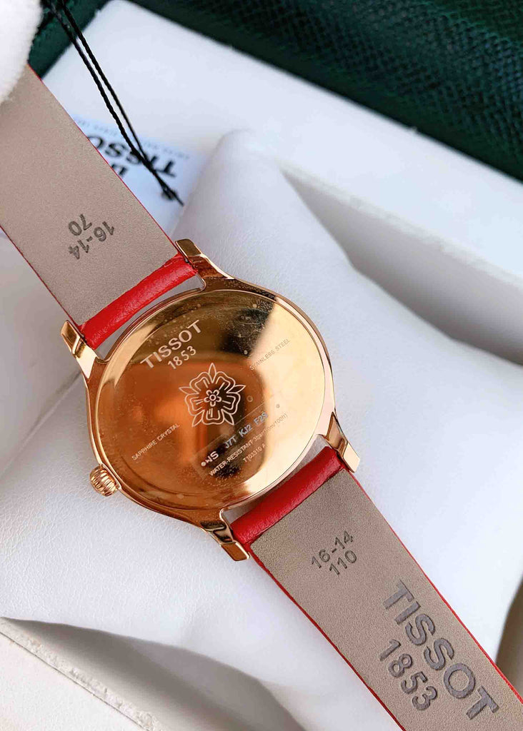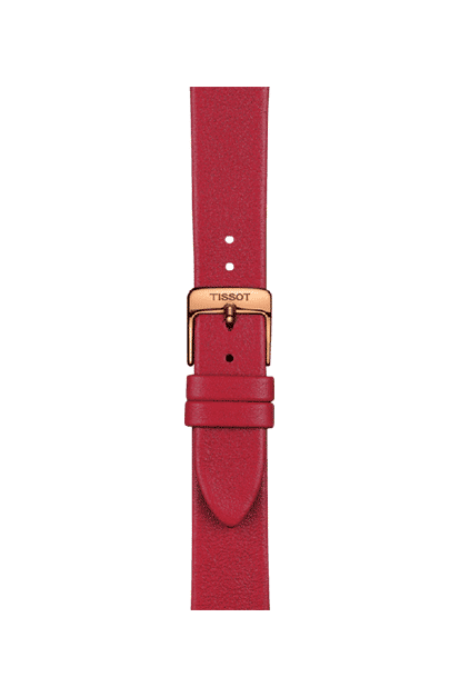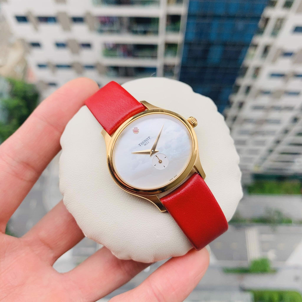 Rose gold PVD stainless steel case with a red (cowhide) leather strap. Fixed rose gold PVD bezel. White mother of pearl dial with rose gold-tone dauphine-style hands. No markers. Dial Type: Analog. Small seconds sub-dial. ETA caliber 980.153 quartz movement. Scratch resistant sapphire crystal. Pull / push crown. Solid case back. Oval case shape. Case dimensions: 31.4 mm x 28 mm. Case thickness: 6.6 mm. Band width: 16 mm. Tang clasp. Water resistant at 30 meters / 100 feet. Functions: hour, minute, small second. Bella Ora Series. Casual watch style. Watch label: Swiss Made. Tissot Bella Ora White Mother of Pearl Dial Ladies Watch T103.310.36.111.01.