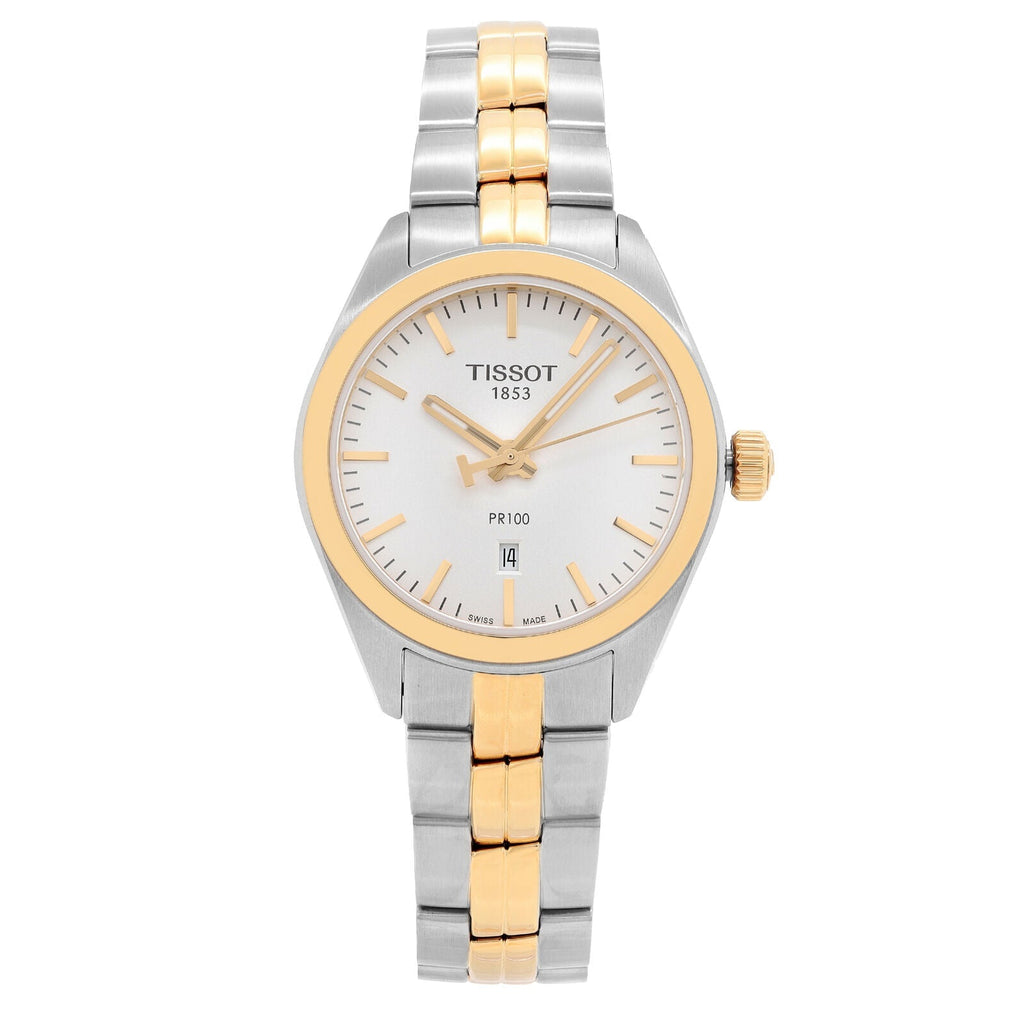 TISSOT PR100 T101.210.22.031.01. Stainless steel case with a two-tone (silver and rose gold-tone) stainless steel bracelet. Fixed rose gold-tone stainless steel bezel. Silver dial with rose gold-tone hands and index hour markers. Minute markers around the outer rim. Dial Type: Analog. Luminescent hands. Date display above the 6 o’clock position. ETA Caliber F04.111 quartz movement. Scratch resistant sapphire crystal. Pull / push crown. Solid case back. Case size: 33 mm. Case thickness: 9 mm. Round case shape. Band width: 16 mm. Butterfly clasp. Water resistant at 100 meters / 330 feet.