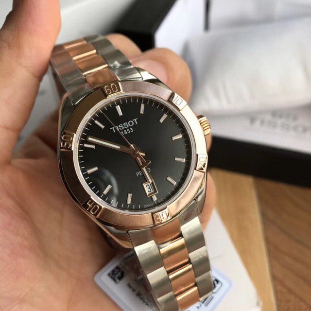 The Tissot PR 100 is a classic watch destined to be worn often and for every occasion. It features the simple and elegant face the collection is loved for, with the pared-back aesthetic symbolizing luxury, quality and classic style. This women's model from the Tissot PR 100 collection has a two-tone 316L stainless steel case with rose gold-colored PVD coating and an anthracite-colored dial.