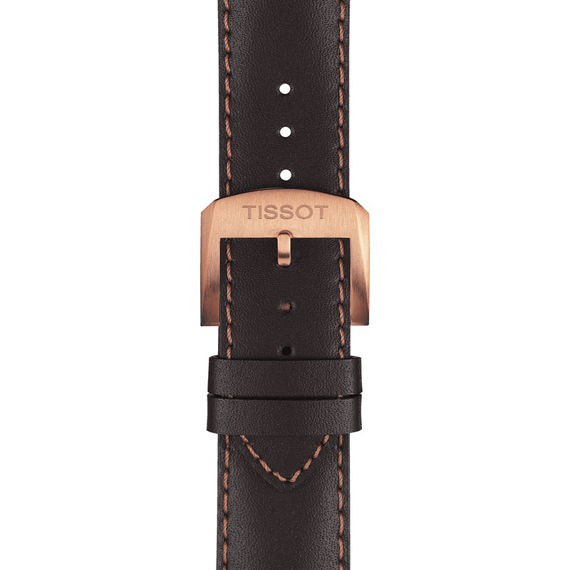 Rose gold PVD stainless steel case with a brown leather strap. Fixed rose gold PVD stainless steel with a brown top ring showing tachymeter markings bezel. Silver dial with luminous rose gold-tone hands and index hour markers. Arabic numeral marks the 12 o'clock position. minute markers around the outer rim. Dial Type: Analog. Luminescent hands. Date display at the 4 o'clock position. Chronograph - three sub-dials displaying: 60 second, 30 minute and 1/10th of a second. ETA Caliber G10.211 quartz movement. Scratch resistant sapphire crystal. Pull / push crown. Solid case back. Round case shape, case size: 42 mm, case thickness: 10.72 mm. Band width: 19 mm. Tang clasp. Water resistant at 100 meters / 330 feet. Functions: chronograph, date, hour, minute, second, tachymeter. Sport watch style. Watch label: Swiss Made. Item Variations: T095 417 36 037 01, T095-417-36-037-01, T095/417/36/037/01, T0954173603701. Tissot Quickster Chronograph Silver Dial Unisex Watch T095.417.36.037.01.