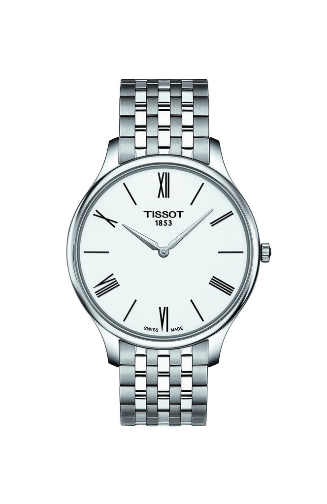 Stainless steel case with a stainless steel bracelet. Fixed stainless steel bezel. White dial with silver-tone alpha-style hands and alternating Roman numeral and index hour markers. Dial Type: Analog. ETA caliber E64.031 quartz movement. Scratch resistant sapphire crystal. Pull / push crown. Solid case back. Round case shape. Case size: 39 mm. Case thickness: 5.2 mm. Band width: 18 mm. Butterfly clasp. Water resistant at 30 meters / 100 feet. Functions: hour, minute. Casual watch style. Watch label: Swiss Made. Tissot Tradition 5.5 White Dial Men's Watch T063.409.11.018.00.