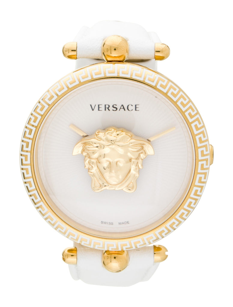 Featuring a white round sunray dial, this women's analog watch from Versace is sure to catch your attention. The dial with IPYG exudes plain two hands, Medusa 3D at the centre between two crystals and a crown for time adjustment. The genuine leather strap comes in a white hue that further elevates the look of the watch. Product Warranty - does not cover damage caused by accidents, improper use, theft, loss of the watch. Also excluded from the warranty are the strap or bracelet, the battery and the crystal.