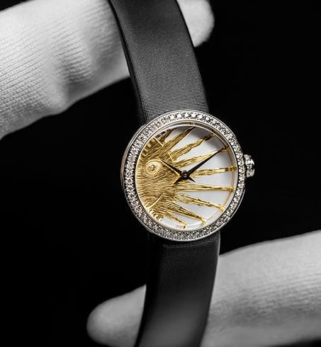 With no index, only two polished dauphine hands accompany the mischievous off-center sunburst on the dial, set with a small diamond as a pupil. The iconic motif from the Rose des Vents Céleste jewelry collection is thus free to express itself without hindrance and, thanks to the meticulously chiseled metal work that shapes it, offers a captivating movement effect...