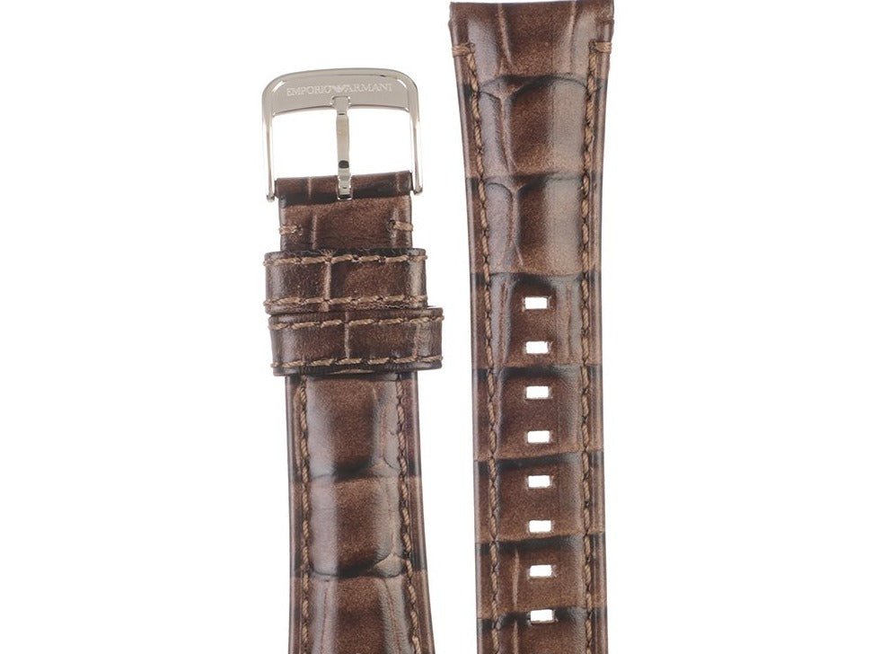 Stainless steel case with a brown croco-embossed leather strap. Fixed stainless steel bezel. Cream dial with rose gold-tone hands and alternating Arabic numeral and index hour markers. Minute markers around the outer rim. The Emporio Armani logo appears at the 12 o'clock position. Dial Type: Analog. Date display between the 4 and 5 o'clock positions. Chronograph - three sub-dials displaying: 60 second, 60 minute and 24 hour. Quartz movement. Scratch resistant mineral crystal. Solid case back. Case size: 43 mm. Case thickness: 12 mm. Round case shape. Band width: 22 mm. Tang clasp. Water resistant at 30 meters / 100 feet. Functions: chronograph, date, hour, minute, second. Casual watch style. Emporio Armani Classic Chronograph Cream Dial Men's Watch AR1878.