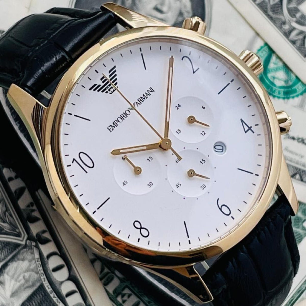 Emporio Armani AR1892 is a functional and handsome Gents watch . Material of the case is PVD Gold plated and the White dial gives the watch that unique look. The features of the watch include (among others) a chronograph and date function. This model has got 50 meters water resistance – it can be submerged in water for periods, so can be used for swimming and fishing. It is not recommended for high impact water sports. The watch is shipped with an original box and a guarantee from the manufacturer.