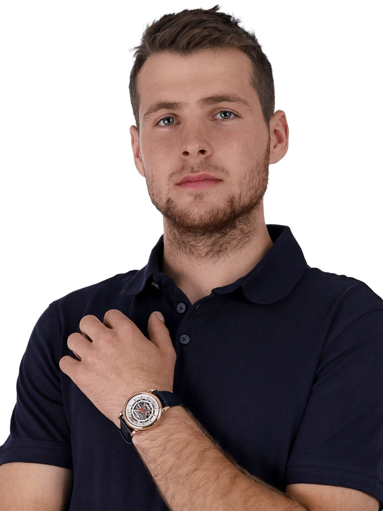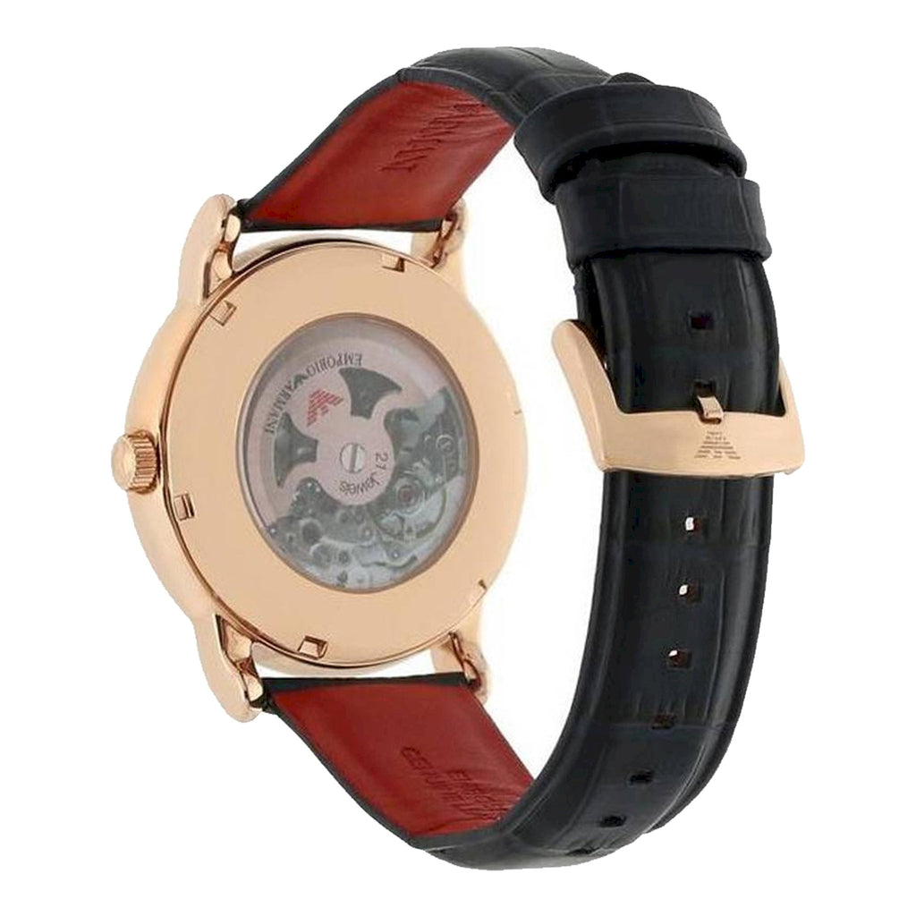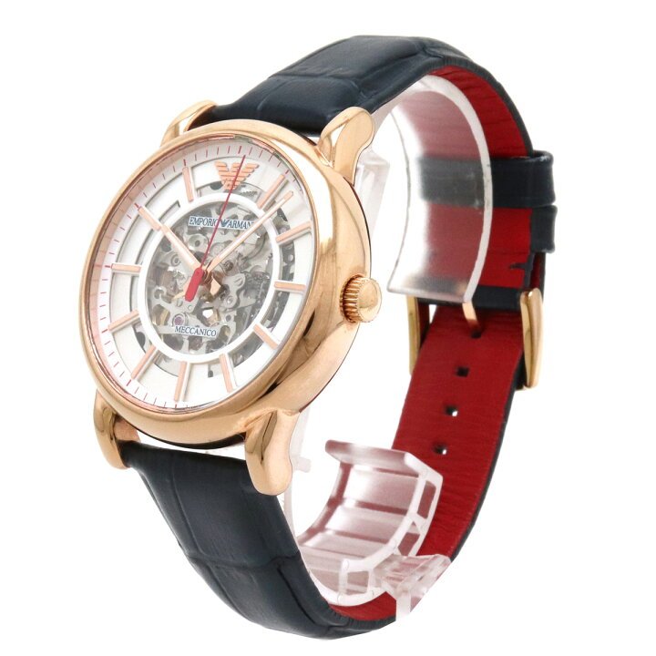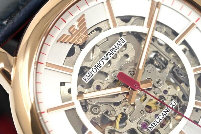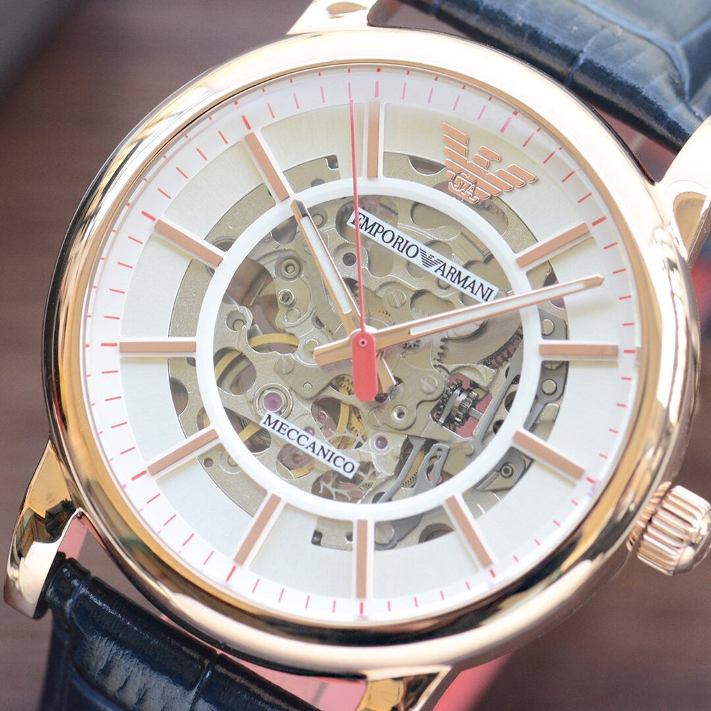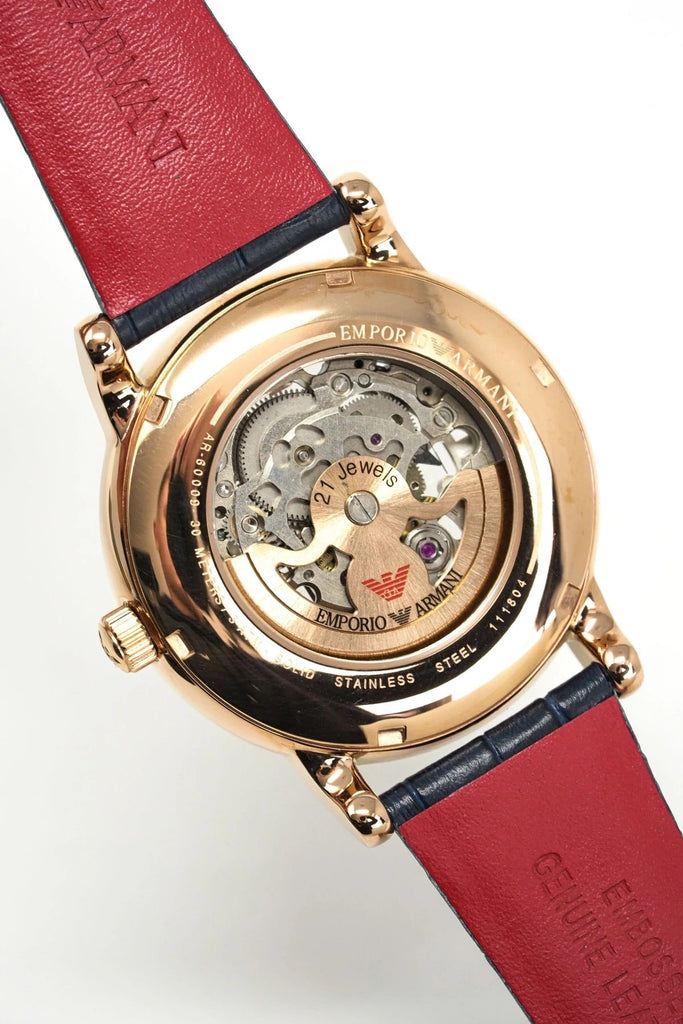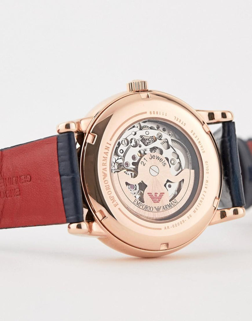 Rose gold-tone stainless steel case with a blue leather strap. Fixed rose gold-tone bezel. White (skeleton centered) dial with luminous rose gold-tone hands and index hour markers. Minute markers around the outer rim. The Emporio Armani eagle appears at the 12 o'clock position. Dial Type: Analog. Luminescent hands. Automatic movement. Scratch resistant mineral crystal. Pull / push crown. Transparent case back. Round case shape. Case size: 43 mm. Case thickness: 13 mm. Band width: 22 mm. Tang clasp. Water resistant at 30 meters / 100 feet. Functions: hour, minute, second. Casual watch style. Emporio Armani Skeleton Automatic White Dial Watch AR60009.