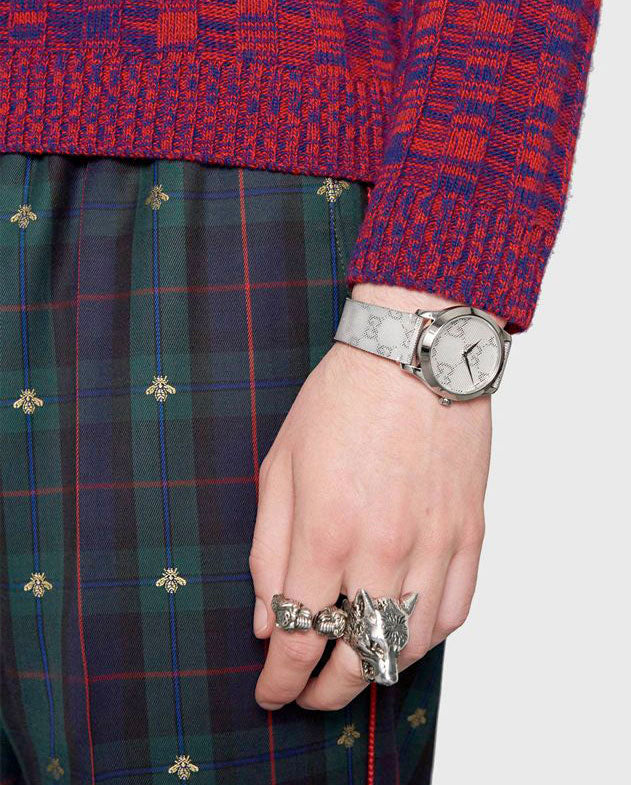 This Gucci G-Timeless ladies embodies the brand's Italian flair. Expertly crafted, this fashion-forward watch is branded with Gucci's signature GG logo on both the leather strap and dial. Stainless steel 38mm case.