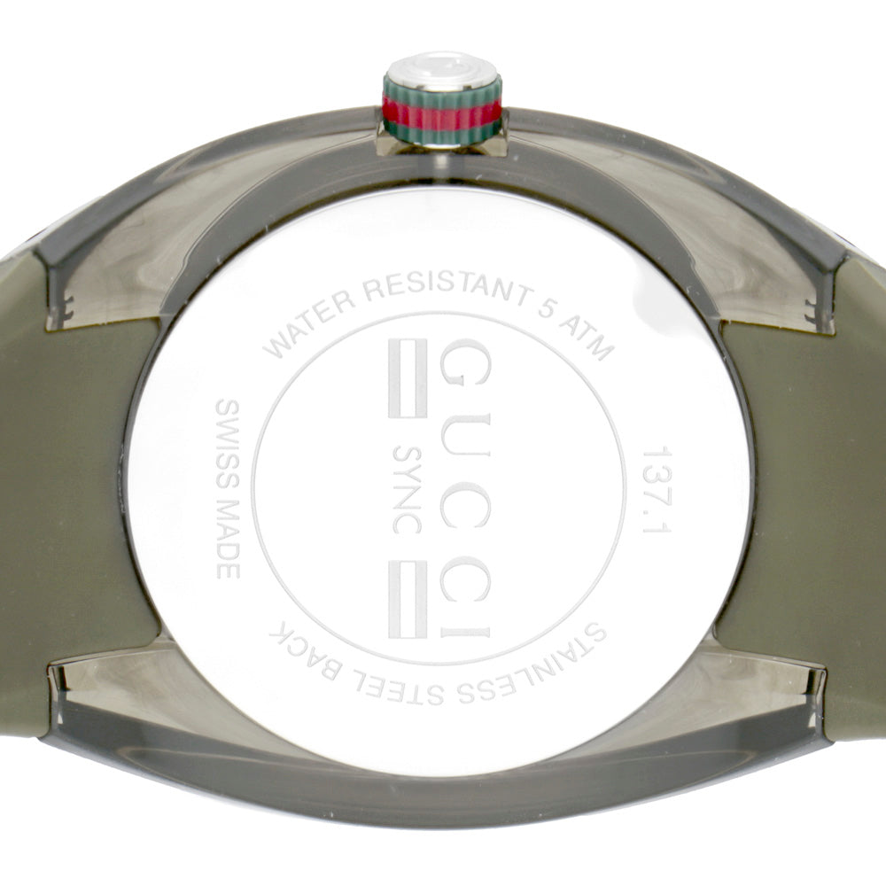 Additional Gucci detailing can be seen in the interlocking 'GG' symbol on the dial in a matt finish, and the Gucci logo etched on the stainless steel case, at 9 o'clock. With its stadium-shaped steel bezel, sun-brushed dial, stainless steel and khaki transparent nylon case and khaki rubber strap, the GUCCI SYNC offers a cool blend of colors, textures and materials that combine to create a timepiece with a distinctly current and urban feel.