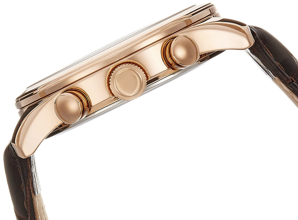 Rose gold-tone stainless steel case with a brown leather strap. Stainless steel stainless steel bezel. Bronze dial with rose gold-tone hands and index-Roman numerals hour markers. Minute markers around the outer rim. Dial Type: Analog. Date display at the 3 o'clock position. Chronograph - three sub-dials displaying: 60 second, 60 minute and 1/10th of a second. Quartz movement.