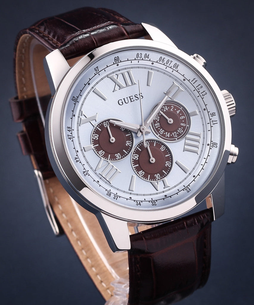 Dial Type: Analog. Luminescent hands. Chronograph - three brown sub-dials displaying: 60 second, 60 minute and 24 hour. Quartz movement. Scratch resistant mineral crystal. Solid case back. Case size: 45 mm. Case thickness: 12 mm. Round case shape. Tang clasp. Water resistant at 100 meters / 330 feet. Casual watch style. Guess Horizon Chronograph Blue Dial Men's Watch W0380G6.