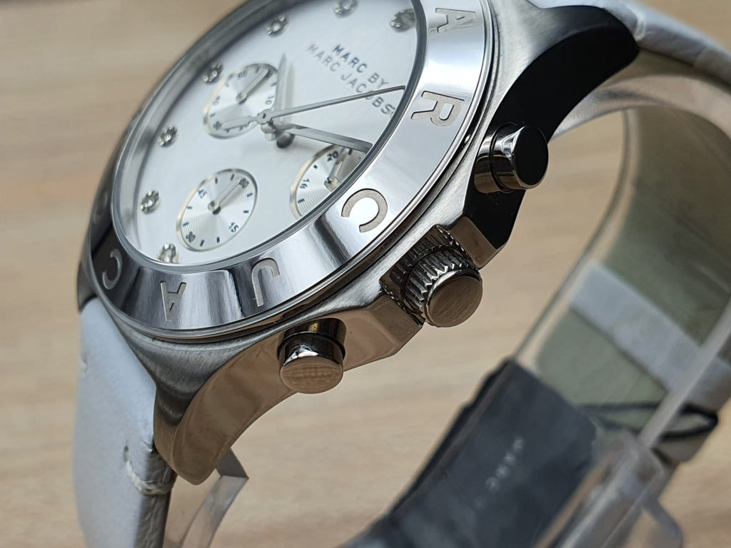Experience luxury and style with the Marc Jacobs Blade White Dial White Leather Strap Watch for Women - MBM1187. The sleek and chic design, featuring a white dial and leather strap, adds a touch of elegance to any outfit. Perfect for the modern woman who values both fashion and functionality.