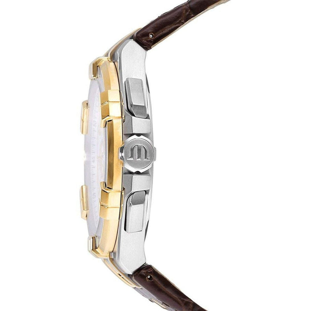 Elevate your style with the Maurice Lacroix Aikon Chronograph watch. Its sleek white dial complements the brown leather strap, bringing sophistication to any outfit. Stay on time with its precise chronograph function. Experience luxury and precision in one timepiece.