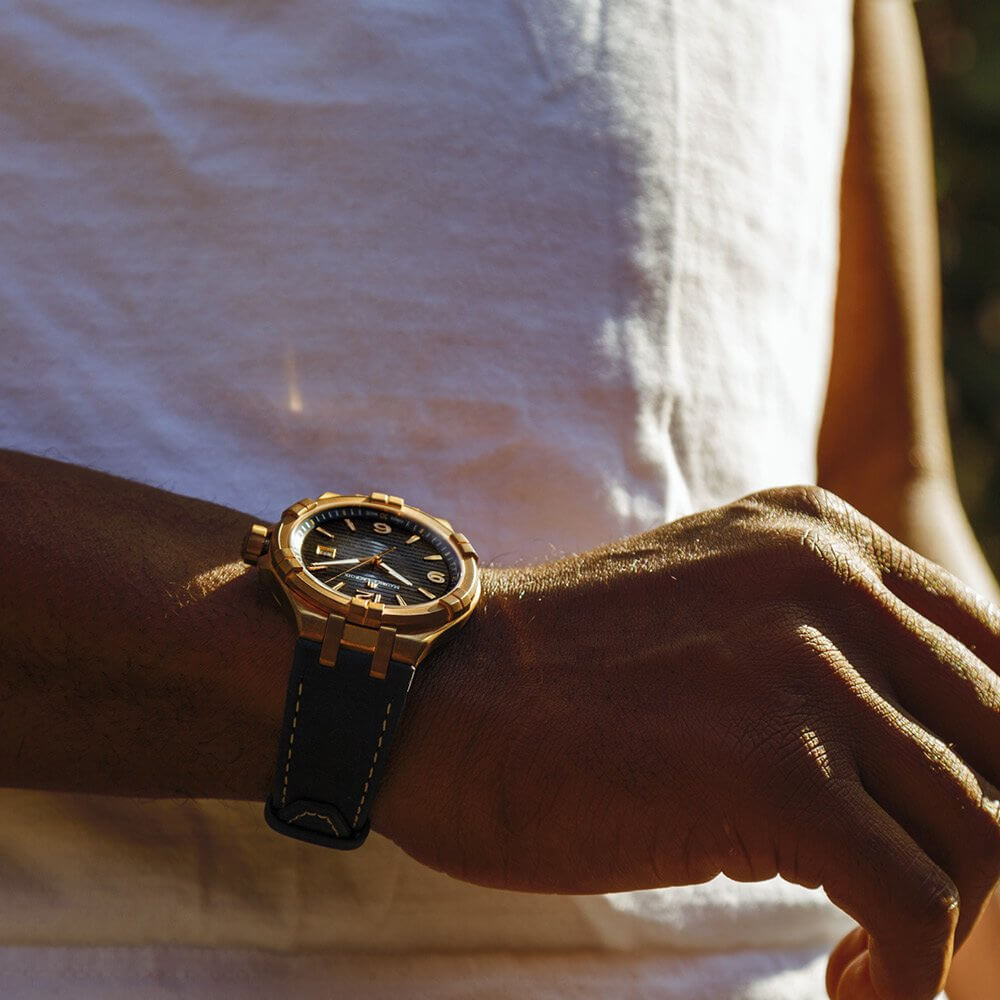 With a sleek 42mm case that seamlessly blends with the bronze bezel, creating a harmonious and visually pleasing look. Its dial showcases golden Arabic numerals, hour markers, and hands, adding a touch of elegance to the timepiece. With a water resistance of up to 200 meters, it's ready to partake in water-related activities.