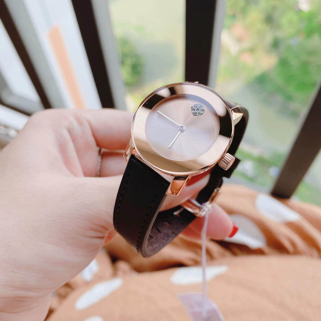 Rose gold PVD stainless steel case with a brown leather strap. Fixed rose gold PVD bezel. Rose dial with rose gold-tone hands. No markers. A crystal-filled Movado dot appears at the 12 o'clock position. Dial Type: Analog. Quartz movement. Scratch resistant K1 mineral crystal. Pull / push crown. Solid case back. Case size: 36 mm. Round case shape. Tang clasp. Water resistant at 30 meters / 100 feet. Functions: hour, minute. Casual watch style. Movado Bold Rose Dial Brown Leather Unisex Watch 3600395.