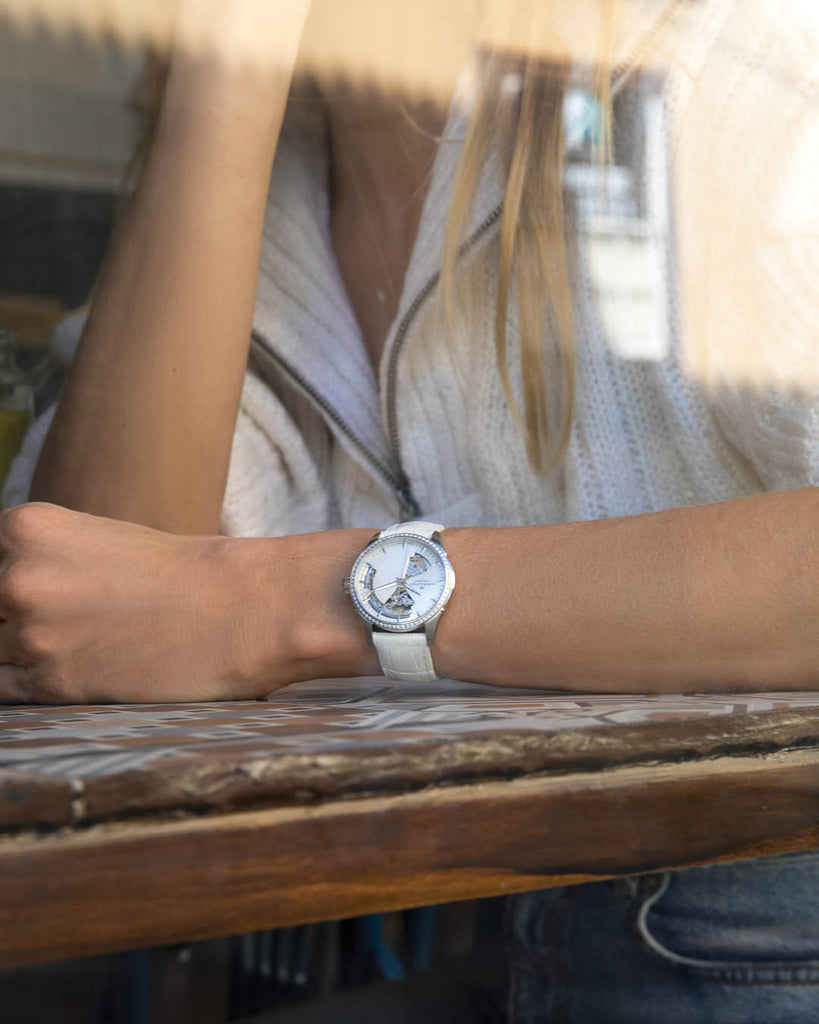 Add a luxurious touch to your outfit with this pure, feminine, modern watch. Through the brand’s unique Crystalline technology, the stainless steel case is set with about 850 crystals, plus a silver-white radiographic textured dial and a white leather strap. The overall effect is harmonious and pleasing.