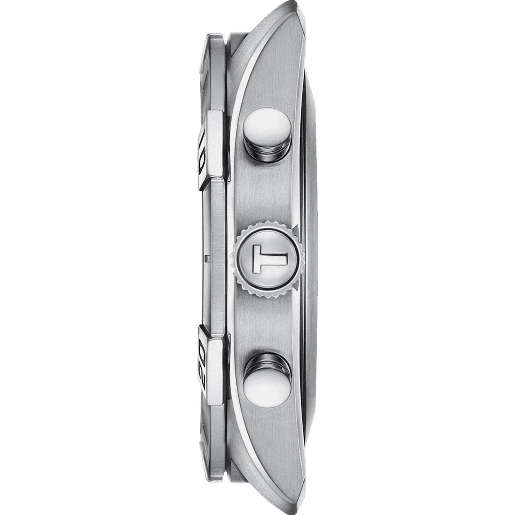 Stainless steel case with a brown (cow) leather strap. Fixed stainless steel bezel. Silver dial with luminous silver-tone hands and index hour markers. Minute markers around the outer rim. Dial Type: Analog. Luminescent hands and markers. Date display between the 4 and 5 o'clock positions. Chronograph - three sub-dials displaying: 60 second, 30 minute and 1/10th of a second. ETA caliber G10.212 quartz movement. Scratch resistant sapphire crystal. Solid case back. Round case shape. Case size: 44 mm. Case thickness: 11.1 mm. Band width: 22 mm. Tang clasp. Water resistant at 100 meters / 330 feet. Functions: chronograph, date, hour, minute, second. Sport watch style. Watch label: Swiss Made. Tissot Chronograph Quartz Silver Dial Men's Watch T101.617.16.031.00.